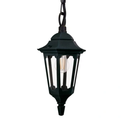 Parish pendant light for outdoor use The black Parish pendant light made of aluminium with transparent glass is modelled on a lantern and fits into the exterior of antique or rustic buildings. The light shines all around through the clear glass panes. A transparent lamp with filament LED bulbs looks particularly decorative behind the clear glass panes. The suspension system can be varied thanks to the chain suspension.