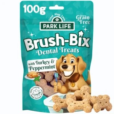 PARK LiFE, Brush Bix Dental Dog Treats 8x100g Pouch Bulk Box, Turkey & Peppermint, Helps Fix Bad Breath and Take Plaque Off, Reduces Tartar, Puppy Safe, Grain Free, All Natural, Fresh Biscuits