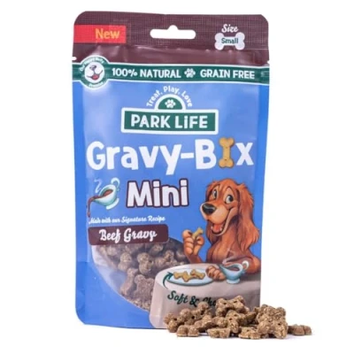 Bone Shaped treats made with PARK LiFE's signature Recipe, a treat your dog deserves INGREDIENTS: Made with Peas, Chickpeas, Potato, Glycerine, Sweet Potato, Beef Gravy (Cold Pressed Rapeseed Oil, Beef, Dried Apple, Yeast Extract, Parsley, Thyme, Oregano) Gravy Bix are our yummiest biscuits yet! Made with our signature recipe gravy and gently baked to deliver a delectably soft and chewy treat that dogs can't resist. All PARK LiFE biscuits are made to the highest standards using just a few simple ingredients, meaning they're so wholesome, even humans can munch them! As seen on Dragon's Den