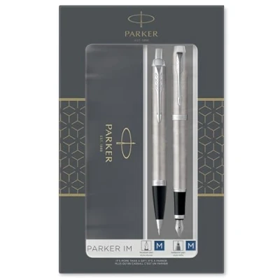 Duo features one IM Ballpoint Pen and one IM Fountain Pen presented in a premium gift box; ideal for professionals IM pens combine comfort and simplicity with high-performance functionality Expertly crafted stainless steel, accented by high-shine chrome trims and the signature Parker arrowhead clips Ballpoint pen features a push button mechanism and is fitted with a blue Quinkflow refill for smooth, reliable writing; also accepts Parker Quink gel refills Fountain pen has a medium stainless steel nib with a long blue Quink cartridge for a sophisticated writing experience