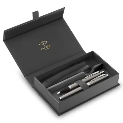 This Parker IM gift set includes a fountain pen, ballpoint pen and distinguished PU pen pouch; a highly desirable gift designed for astute individuals who value authentic items embodying both style and substance Luxurious stainless steel finish on cap and barrel establish these pens as an emblem of understated elegance, finished with the signature Parker arrow clip With its smart, polished and professional silhouette, the Parker IM is the perfect writing instrument to make a lasting impression The sleek, tapered shape, paired with its dependable finishes, makes it a highly functional and reliable partner with unlimited potential Parker pens benefit from over a century of fine writing expertise, resulting in an intricately-crafted writing instrument which delivers a truly exceptional writing experience