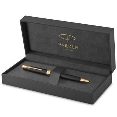 AmazonMatte black lacquer cap and barrel accented by gold-finished clip and trim Ballpoint design with retractable twist mechanism and medium tip Hand assembled and checked for flawless quality Available in a range of beautiful designs and finishes Packaged in a PARKER premium gift box