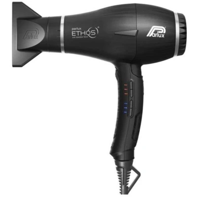 Discover the black Ethos hair dryer from Parlux, powerful with 2300 Watts and a digital motor. Its air flow of 88m3/h and 'Slim' nozzle ensure rapid and effective drying while protecting your joints thanks to its optimal balance. Ideal for all hair types.