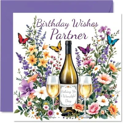 Partner Birthday Card Flowers & Wine Happy for from Boyfriend Girlfriend, 145mm Bday Greeting Cards