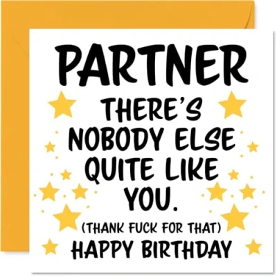 MAKE YOUR PARTNER SMILE WITH THIS UNIQUE BIRTHDAY CARD: This exceptional quality Partner birthday card shows the design 'Partner Theres nobody else quite like you. (Thank fuck for that) Happy Birthday'. If you are looking for an awesome birthday card for Partner, then then this happy birthday Partner card is bound to make them smile. Not just a birthday card for Partner this could also be a birthday gifts for Partner, Boyfriend or Girlfriend. WHAT DO YOU GET: The card is printed on one side and BLANK ON THE INSIDE to allow you to write your very own message. The unique fun design is printed on a specially sourced and environmentally responsible board. At 360 microns thick the natural white one-sided gloss board has a quality look and feel. Supplied with a coloured gummed envelope to complement the design and ready to be sealed and sent in the post. Great Partner birthday cards, Boyfriend birthday card. NO INK SMUDGES: There is nothing worse than writing inside a card to find that the shiny surface makes the ink smudge. This is why we use a high quality one sided coated board. The uncoated side will absorb more of the ink from your pen to make smudging a thing of the past. Partner birthday cards, Partner birthday cards from Boyfriend. SIZES: Greeting Card = 145mm x 145mm, Envelope = 155mm x 155mm, Card Thickness = 360 micron. Happy birthday Partner, Partners birthday card, Partner cards birthday, birthday card Partner, happy birthday Partner card, Partner gifts from Boyfriend. MADE AND QUALITY CHECKED IN THE UK: We print and manufacture all our products right here in the UK so you can be sure of a fast turnaround and a product that is expertly made. Using environmentally responsible premium board our card is conscious of the responsible management of the world's forests - happy birthday card Partner, Partner birthday cards.
