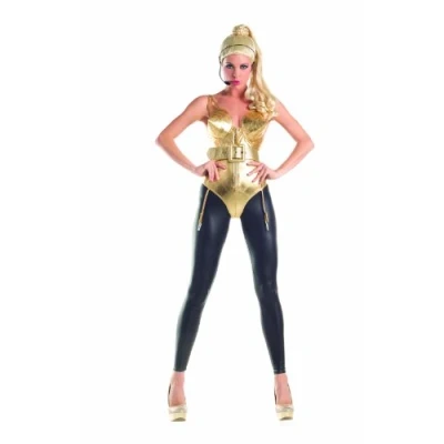 Gold cone cup leotard with removable garters, black leggings, and belt included Wig not included, Colã de ouro com ligas removíveis, leggings pretas e cinto incluídos Peruca não incluída, Gold cone cup leotard with removable garters, black leggings, and belt included Wig not included 100% polyester stretch knit fabric, Manufacturer: Party King