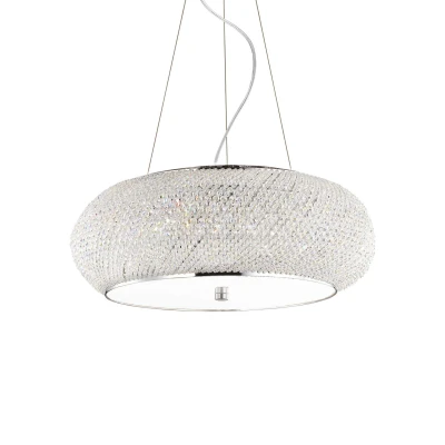 The Pasha collection is characterized by its sophisticated design, featuring a striking chrome finish that exudes modern chicness. The light fixture is crafted from high-quality crystal, glass, and metal, ensuring durability and a premium look. The pendant's unique diffuser comprises strings of crystals that hang gracefully, offering a mesmerizing display of light as it interacts with the surrounding environment. The sandblasted cover at the base of the fitting not only enhances its beauty but also adds a touch of refinement, making it a majestic addition to any room.
