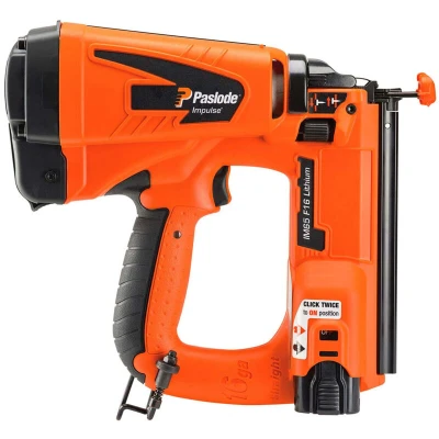 General description The Paslode IM65 F16 Lithium Straight Brad Nailer is designed for all second fix applications, firing 16 gauge straight brads ranging from 16 to 64mm. Its lightweight and well-balanced design allows for easy movement in tight spaces, ensuring fatigue-free working. The tool features an easy rear-loading magazine that holds 2 strips of brads, a nail lockout to prevent blank firing and minimize wood damage, and a quick clear nose cover for easy access in case of a jam. Additional features include a reversible belt hook, an on/off battery lock position, and tool-free depth adjustment. Technical specifications Power (Impact Force): 30 Joules Fastener Length Range: 16-64mm Fixings Per Second: 2-3 Fixings Per Hour: 1,000 Magazine Capacity: 100 Fuel Cell Capacity: 1,000 shots Battery Capacity: 2.1Ah Fixings Per Battery Charge: 10,000 shots Battery Charge Time: 90 minutes Weight: 2.1kg Compatibility and accessories Supplied with: 1 x 2.1Ah Li-ion Battery 1 x Charger 1 x