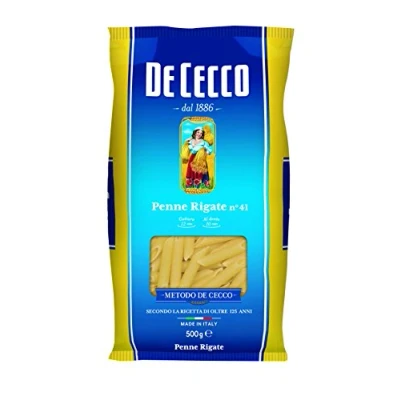 JoybuyDe Cecco Penne Rigate 500g is made in Italy using the best durum wheat, coarse ground semolina, and cold mountain water, then slow dried and bronze drawn for superior flavor and texture. Always "al dente," this pasta is packaged in a 100% recyclable pack and may contain traces of soy or mustard.