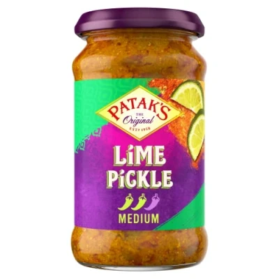 Patak's lime pickle is a medium heat, delicious blend of limes and aromatic spices a traditional Indian restaurant favorite Delicious with a naan or pappadum, and wonderful in a sandwich, salad, or with cold meats No artificial colours, flavours Suitable for vegetarians Store in a cool, dry place