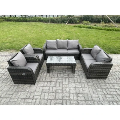 General description This 7-seater classic outdoor rattan sofa set is a perfect addition to your patio or garden. Made from high-quality PE rattan and durable galvanized steel construction, it offers sturdiness and longevity, allowing it to be used outdoors all year round. This set is ideal for gathering with family and friends. Technical specifications 2 x Reclining Chairs: 74L x 67W x 79H cm 1 x Love Sofa: 124W x 67D x 79H cm 1 x 3-Seater Sofa: 177W x 67D x 79H cm 1 x Oblong Coffee Table: 105L x 50W x 48H cm Color: Dark grey mixed rattan with dark grey fabric Seat Cushion Thickness: 8 cm Installation Items come flat packed and are easy to assemble. The furniture features sturdy galvanized steel tube metal frames with powder coating to prevent rust. The PE rattan is completely handmade, and the set includes 5mm thick transparent tempered glass with suckers on the surface to prevent sliding. Usage The armchairs are adjustable, allowing you to change the inclination of the chair back
