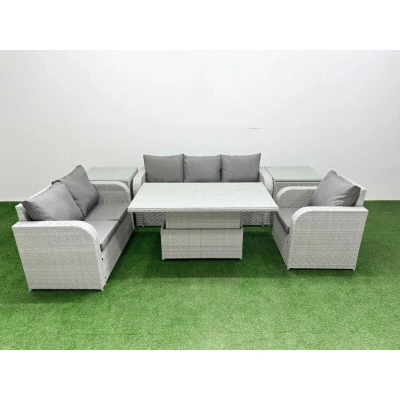 General description This deluxe 6-piece rattan sofa set is a great addition to your patio or garden, made of high-quality PE rattan and durable galvanized steel. The set includes adjustable reclining chairs, a loveseat, a 3-seater sofa, and two side tables, all designed for comfort and style. Technical specifications Reclining chair size: 74W x 69D x 79H cm Loveseat size: 124W x 67D x 79H cm 3-seater sofa size: 177W x 67D x 79H cm Side table size: 65L x 65W x 66H cm Lifting table size: 140L x 80W x 68/48H cm (height adjustable from 68 cm to 48 cm) Sofa weight capacity: 250 kg Table weight capacity: 80 kg Seat cushion thickness: 8 cm Glass thickness: 5 mm tempered glass Installation Items come flat packed and are easy to assemble. Sturdy galvanized steel tube metal frames with powder coating to prevent rust. Usage Low maintenance with removable cushion covers. Keep cushions indoors or use a rain cover when not in use. Use a rain cover for the furniture if not in use for an extended