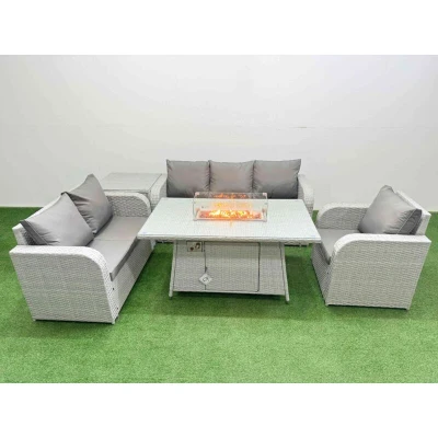 General description This Fimous Patio PE Wicker 6 Seater Outdoor Rattan Furniture Set includes a reclining chair, loveseat sofa, 3-seater sofa, side table, and a firepit dining table. The set is designed for comfort and style, featuring light grey rattan with dark grey fabric. The armchairs are adjustable, allowing you to change the backrest inclination from 90° to 130° for personalized comfort. Technical specifications Reclining chair dimensions: 74W x 69D x 79H cm Loveseat dimensions: 124W x 67D x 79H cm 3-seater sofa dimensions: 177W x 67D x 79H cm Side table dimensions: 65L x 65W x 66H cm Firepit dining table dimensions: 140L x 80W x 69H cm Sofa weight capacity: 250 kg Table weight capacity: 80 kg Material: Light grey PE rattan with dark grey fabric Seat cushion thickness: 8 cm Glass top thickness: 5 mm tempered glass Installation Items come flat packed and are easy to assemble. The set features sturdy galvanized steel tube metal frames with powder coating to prevent rust. Usage