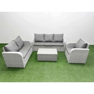 General description This deluxe 4 piece rattan sofa set is a great addition to your patio or garden, made of high-quality PE rattan and durable galvanized steel. The set includes a reclining chair, a loveseat sofa, a 3-seater sofa, and a rectangular coffee table, all designed for comfort and style. Technical specifications Reclining chair dimensions: 74W x 69D x 79H cm Loveseat dimensions: 124W x 67D x 79H cm 3-seater sofa dimensions: 177W x 67D x 79H cm Table dimensions: 85L x 50W x 37H cm Sofa weight capacity: 250 kg Table weight capacity: 80 kg Color: Light grey rattan with dark grey fabric Installation Items come flat packed and are easy to assemble. Usage Low maintenance with removable cushion covers. Keep cushions indoors or use a rain cover when not in use. Use a rain cover for the furniture if not in use for a long time. Other information Adjustable armchairs with back inclination from 90° to 130°. 5mm thick transparent tempered glass with suckers on the surface to prevent