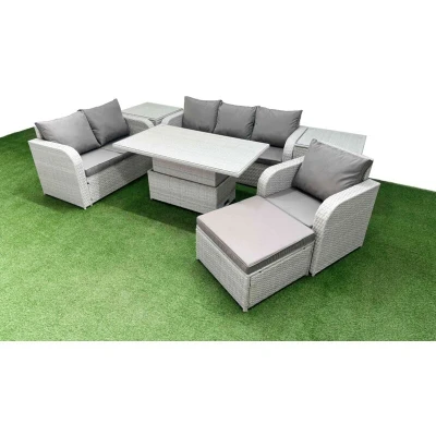 General description This deluxe PE rattan sofa set is an excellent addition to your patio or garden, crafted from high-quality PE rattan and durable galvanized steel. The set includes a reclining chair, loveseat, three-seater sofa, big footstool, and two side tables, all designed for comfort and style. Technical specifications Reclining chair size: 74W x 69D x 79H cm Loveseat size: 124W x 67D x 79H cm Three-seater sofa size: 177W x 67D x 79H cm Big footstool size: 65L x 65W x 34H cm Side table size: 65L x 65W x 66H cm Lifting table size: 140L x 80W x 68/48H cm (height adjustable) Sofa weight capacity: 250 kg Table weight capacity: 80 kg Material: Light grey rattan with dark grey fabric Cushion thickness: 8 cm Glass thickness: 5 mm tempered glass Installation Items come flat packed and are easy to assemble. Sturdy galvanized steel tube metal frames with powder coating to prevent rust. Usage Adjustable armchairs with a reclining backrest that can be set from 90° to 130°. Low maintenance