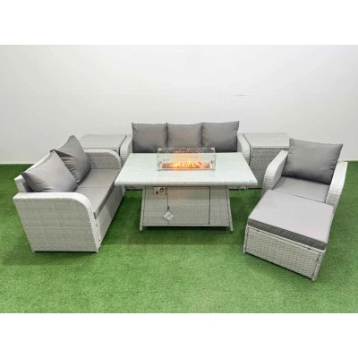 General description This Fimous Patio PE Wicker 7 Seater Outdoor Rattan Furniture Set is designed for comfort and style, featuring a light grey rattan finish complemented by dark grey fabric. The set includes a reclining chair, loveseat, three-seater sofa, big footstool, and two side tables, making it perfect for outdoor gatherings. The adjustable armchairs allow for personalized comfort, and the set is crafted with durable materials for long-lasting use. Technical specifications Reclining chair dimensions: 74W x 69D x 79H cm Loveseat dimensions: 124W x 67D x 79H cm 3-seater sofa dimensions: 177W x 67D x 79H cm Big footstool dimensions: 65L x 65W x 34H cm Side table dimensions: 65L x 65W x 66H cm (2 pieces) Firepit dining table dimensions: 140L x 80W x 69H cm Sofa weight capacity: 250 kg Table weight capacity: 80 kg Material: PE rattan, galvanized steel tube frames with powder coating Seat cushion thickness: 8 cm Glass top: 5 mm thick tempered glass Installation Items come flat packed