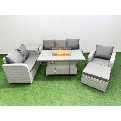 General description This Fimous Patio PE Wicker 7 Seater Outdoor Rattan Furniture Set includes a reclining chair, loveseat sofa, 3-seater sofa, big footstool, side table, and a firepit dining table. The set is designed for comfort and style, featuring light grey rattan with dark grey fabric. The armchairs are adjustable, allowing you to change the backrest inclination from 90° to 130° for personalized comfort. Technical specifications Reclining chair dimensions: 74W x 69D x 79H cm Loveseat dimensions: 124W x 67D x 79H cm 3-seater sofa dimensions: 177W x 67D x 79H cm Big footstool dimensions: 65L x 65W x 34H cm Side table dimensions: 65L x 65W x 66H cm Firepit dining table dimensions: 140L x 80W x 69H cm Sofa weight capacity: 250 kg Table weight capacity: 80 kg Material: PE rattan, galvanized steel tube frames with powder coating Seat cushion thickness: 8 cm Glass top thickness: 5 mm tempered glass Installation Items come flat packed and are easy to assemble. Ensure to check all parts