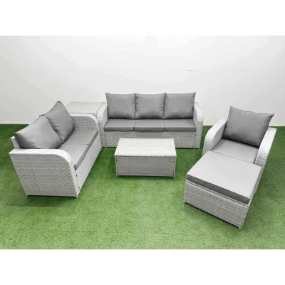 General description This deluxe 6-piece rattan sofa set is an excellent addition to your patio or garden, crafted from high-quality PE rattan and durable galvanized steel. The set includes a reclining chair, a loveseat sofa, a 3-seater sofa, two side tables, and a rectangular coffee table, all designed for comfort and style. Technical specifications Reclining chair dimensions: 74W x 69D x 79H cm Loveseat dimensions: 124W x 67D x 79H cm 3-seater sofa dimensions: 177W x 67D x 79H cm Side table dimensions: 65L x 65W x 66H cm (2 pieces) Coffee table dimensions: 85L x 50W x 37H cm Sofa weight capacity: 250 kg Table weight capacity: 80 kg Seat cushion thickness: 8 cm Material: Light grey rattan with dark grey fabric Installation Items come flat packed and are easy to assemble. Includes sturdy galvanized steel tube metal frames with powder coating to prevent rust. Usage The two armchairs are adjustable, allowing you to change the backrest inclination from 90° to 130°. Low maintenance with