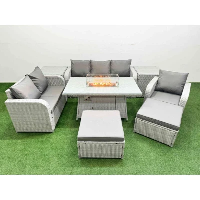 General description This Fimous Patio PE Wicker 8 Seater Outdoor Rattan Furniture Set includes a firepit dining table, reclining chairs, a loveseat sofa, a three-seater sofa, two big footstools, and two side tables. The set is designed for comfort and style, featuring light grey rattan with dark grey fabric. The adjustable armchairs allow for reclining from 90° to 130° for personalized comfort. Technical specifications Reclining chair dimensions: 74W x 69D x 79H cm Loveseat dimensions: 124W x 67D x 79H cm Three-seater sofa dimensions: 177W x 67D x 79H cm Big footstool dimensions: 65L x 65W x 34H cm Side table dimensions: 65L x 65W x 66H cm Firepit dining table dimensions: 140L x 80W x 69H cm Sofa weight capacity: 250 kg Table weight capacity: 80 kg Seat cushion thickness: 8 cm Material: PE rattan, galvanized steel frame, tempered glass Installation Items come flat packed and are easy to assemble. Usage Place the gas fire pit on the glass top, not under it. Check for gas leaks at the