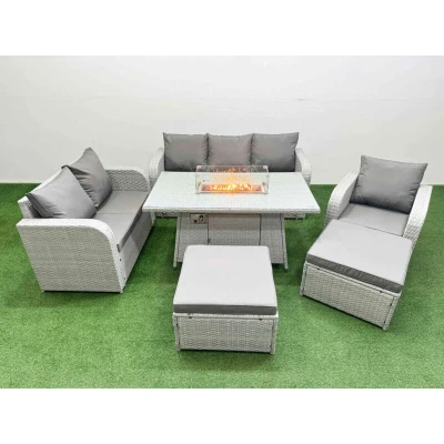General description This Fimous Patio PE Wicker 8 Seater Outdoor Rattan Furniture Set is designed for comfort and style, featuring a reclining chair, loveseat, three-seater sofa, and two large footstools. The set includes a firepit dining table, making it perfect for outdoor gatherings. The light grey rattan is complemented by dark grey fabric cushions, providing a modern aesthetic for your patio or garden. Technical specifications Reclining chair dimensions: 74W x 69D x 79H cm Loveseat dimensions: 124W x 67D x 79H cm 3-seater sofa dimensions: 177W x 67D x 79H cm Big footstool dimensions: 65L x 65W x 34H cm Firepit dining table dimensions: 140L x 80W x 69H cm Sofa weight capacity: 250 kg Table weight capacity: 80 kg Material: Light grey PE rattan with dark grey fabric cushions Seat cushion thickness: 8 cm Glass top thickness: 5 mm tempered glass Installation Items come flat packed and are easy to assemble. Sturdy galvanized steel tube metal frames with powder coating to prevent rust.