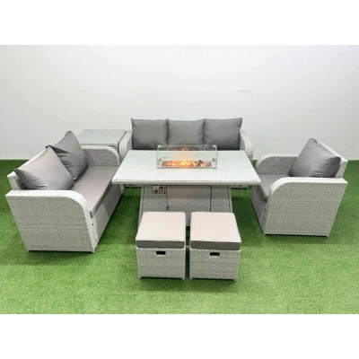 General description This Fimous Patio PE Wicker 8 Seater Outdoor Rattan Furniture Set includes a firepit dining table, reclining chairs, a loveseat sofa, a 3-seater sofa, stools, and a side table. The set is designed for comfort and style, featuring light grey rattan with dark grey fabric. The adjustable armchairs allow for reclining from 90° to 130° for personalized comfort. Technical specifications Reclining chair size: 74W x 69D x 79H cm Loveseat size: 124W x 67D x 79H cm 3-seater sofa size: 177W x 67D x 79H cm Stool size: 40W x 40D x 34H cm (2 stools included) Side table size: 65L x 65W x 66H cm Firepit dining table size: 140L x 80W x 69H cm Sofa weight capacity: 250 kg Table weight capacity: 80 kg Seat cushion thickness: 8 cm Material: PE rattan, galvanized steel tube frames, tempered glass Installation Items come flat packed and are easy to assemble. Ensure to check the product carefully before signing for delivery. If there is any damage upon arrival, mark it on the receipt for