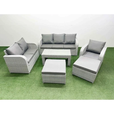 General description This deluxe PE rattan sofa set is an excellent addition to your patio or garden, crafted from high-quality PE rattan and durable galvanized steel. The set includes a reclining chair, a loveseat, a three-seater sofa, two big footstools, and an oblong coffee table, all designed for comfort and style. Technical specifications Reclining chair dimensions: 74W x 69D x 79H cm Loveseat dimensions: 124W x 67D x 79H cm Three-seater sofa dimensions: 177W x 67D x 79H cm Big footstool dimensions: 65L x 65W x 34H cm Table dimensions: 105L x 50W x 48H cm Sofa weight capacity: 250 kg Table weight capacity: 80 kg Color: Light grey rattan with dark grey fabric Installation Items come flat packed and are easy to assemble. Usage Low maintenance; removable cushion covers for easy cleaning. Keep cushions indoors or use a rain cover when not in use. Use a rain cover for the furniture if not in use for an extended period. Other information Adjustable armchairs with a reclining backrest