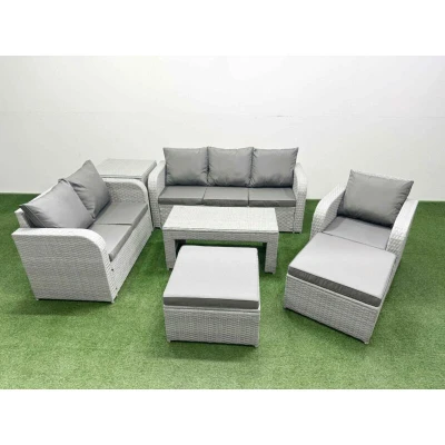 General description This deluxe PE rattan sofa set is an excellent addition to your patio or garden, crafted from high-quality PE rattan and durable galvanized steel. The set includes a reclining chair, a loveseat, a three-seater sofa, two big footstools, and a side table, all designed for comfort and style. Technical specifications Reclining chair dimensions: 74W x 69D x 79H cm Loveseat dimensions: 124W x 67D x 79H cm Three-seater sofa dimensions: 177W x 67D x 79H cm Big footstool dimensions: 65L x 65W x 34H cm (2 units) Side table dimensions: 65L x 65W x 66H cm Coffee table dimensions: 105L x 50W x 48H cm Sofa weight capacity: 250 kg Table weight capacity: 80 kg Seat cushion thickness: 8 cm Material: Light grey rattan with dark grey fabric Installation Items come flat packed and are easy to assemble. Usage Adjustable armchairs with a back inclination range of 90°-130°. Low maintenance with removable cushion covers. Recommended to keep cushions indoors or use a rain cover when not in