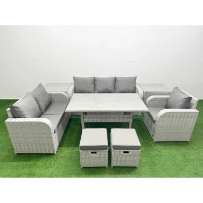 General description This deluxe PE rattan sofa set is an excellent addition to your patio or garden, crafted from high-quality PE rattan and durable galvanized steel. The set includes a variety of seating options and a dining table, providing both comfort and style for outdoor gatherings. Technical specifications Reclining chair dimensions: 74W x 69D x 79H cm Love sofa dimensions: 124W x 67D x 79H cm 3-seater sofa dimensions: 177W x 67D x 79H cm Stool dimensions: 40W x 40D x 34H cm (2 stools included) Side table dimensions: 65L x 65W x 66H cm (2 side tables included) Dining table dimensions: 140L x 80W x 68H cm Sofa weight capacity: 250 kg Table weight capacity: 80 kg Seat cushion thickness: 8 cm Material: Light grey rattan with dark grey fabric Installation Items come flat packed and are easy to assemble. Sturdy galvanized steel tube metal frames with powder coating to prevent rust. Usage Adjustable armchairs with a back inclination range of 90°-130°. Low maintenance with removable