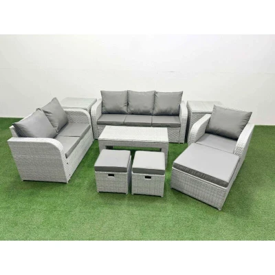 General description This deluxe PE rattan sofa set is a great addition to your patio or garden, made of high-quality PE rattan and durable galvanized steel. The set includes a reclining chair, loveseat sofa, 3-seater sofa, footstool, and side tables, all designed for comfort and style. Technical specifications Reclining chair size: 74W x 69D x 79H cm Loveseat size: 124W x 67D x 79H cm 3-seater sofa size: 177W x 67D x 79H cm Big footstool size: 65L x 65W x 34H cm Fully assembled stool size: 40W x 40D x 34H cm (2 pieces) Side table size: 65L x 65W x 66H cm (2 pieces) Coffee table size: 105L x 50W x 48H cm Sofa weight capacity: 250 kg Table weight capacity: 80 kg Color: Light grey rattan with dark grey fabric Installation Items come flat packed and are easy to assemble. The set features sturdy galvanized steel tube metal frames with powder coating to prevent rust. Usage The two armchairs are adjustable, allowing you to change the inclination of the chair back from 90° to 130° for added