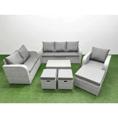 General description This deluxe PE rattan sofa set is an excellent addition to your patio or garden, crafted from high-quality PE rattan and durable galvanized steel. The set includes a reclining chair, loveseat, three-seater sofa, stools, and a rectangular coffee table, all designed for comfort and style. Technical specifications Reclining chair dimensions: 74W x 69D x 79H cm Loveseat dimensions: 124W x 67D x 79H cm Three-seater sofa dimensions: 177W x 67D x 79H cm Stool dimensions: 40W x 40D x 34H cm (2 stools included) Side table dimensions: 65L x 65W x 66H cm (2 tables included) Coffee table dimensions: 85L x 50W x 37H cm Sofa weight capacity: 250 kg Table weight capacity: 80 kg Seat cushion thickness: 8 cm Glass thickness: 5 mm (tempered glass with suckers to prevent sliding) Installation Items come flat packed and are easy to assemble. The set features sturdy galvanized steel tube frames with powder coating to prevent rust. Usage The two armchairs are adjustable, allowing you to