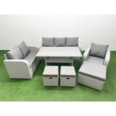 General description This deluxe PE rattan sofa set is a great addition to your patio or garden, made of high-quality PE rattan and durable galvanized steel. The set includes a variety of seating options and a dining table, providing comfort and style for outdoor gatherings. Technical specifications Reclining chair size: 74W x 69D x 79H cm Love sofa size: 124W x 67D x 79H cm 3-seater sofa size: 177W x 67D x 79H cm Big footstool size: 65L x 65W x 34H cm Fully assembled stool size: 40W x 40D x 34H cm (2 units) Dining table size: 140L x 80W x 68H cm Sofa weight capacity: 250 kg Table weight capacity: 80 kg Seat cushion thickness: 8 cm Glass thickness: 5 mm (tempered glass) Installation Items come flat packed and are easy to assemble. Usage Low maintenance; removable cushion covers for easy cleaning. Keep cushions indoors or use a rain cover when not in use. Use a rain cover for the furniture if not in use for an extended period. Other information Adjustable armchairs with a back