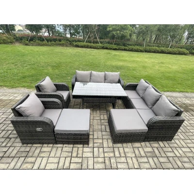 General description This 10 Seater PE rattan outdoor furniture set is an excellent addition to your patio or garden. It is constructed from high-quality PE rattan and durable galvanized steel, ensuring sturdiness and longevity. This garden furniture set is designed for outdoor use all year round. Technical specifications Set Dimensions: 2 x Big footstool: 65L x 65W x 34H cm 2 x Reclining Chairs: 74L x 67W x 79H cm 2 x 3 Seater Sofa: 177W x 67D x 79H cm 1 x Dining Table: 140L x 80W x 69H cm Color: Dark grey mixed rattan with dark grey fabric Seat Cushion Thickness: 8 cm Armrest Width: 9 cm Glass Thickness: 5 mm (clear tempered glass) Installation Items come flat packed and are easy to assemble. Sturdy galvanized steel tube metal frames with powder coating to prevent rust. Usage The 2 armchairs are adjustable, allowing you to change the backrest inclination from 90° to 130°. Low maintenance with removable cushion covers. It is recommended to keep the cushions indoors or use a rain cover