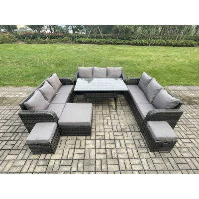 Patio Rattan Garden Furniture Set with Oblong Rectangular Dining Table 3 Footstools 12 Seater Outdoor Lounge Sofa Dark Grey Mixed Fimous