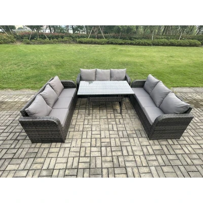 Patio Rattan Garden Furniture Set with Oblong Rectangular Dining Table 9 Seater Outdoor Lounge Sofa Dark Grey Mixed Fimous