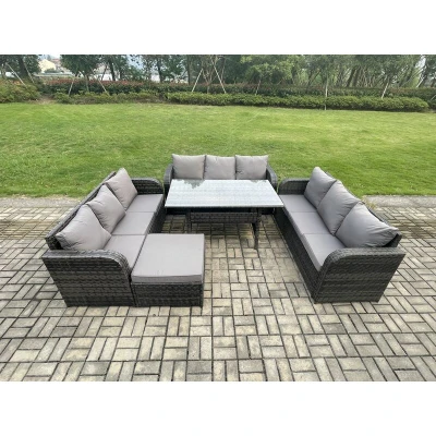 Patio Rattan Garden Furniture Set with Oblong Rectangular Dining Table Big Footstool 10 Seater Outdoor Lounge Sofa Dark Grey Mixed Fimous