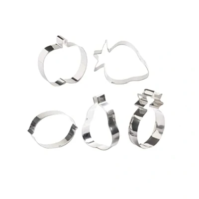 Set of 5 fruit cutters: strawberry, pear, pineapple, apple, lemon. Presented on an ornate card For making sandblasted biscuits, cutting shapes in all types of pasta: sandblasted, sweet, marzipan, salt dough or modelling clay, and for decorating cakes, pastries. Made of stainless steel: a strong, durable, sturdy and food grade material. Easy to use, no sharp corners or edges. Mould height: 2 cm. Easy to clean, preferably by hand to remove all dough residue inside.
