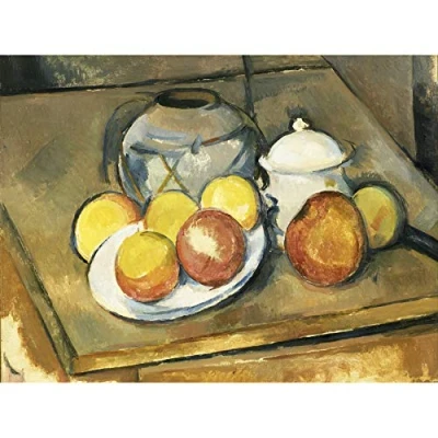 Paul Cezanne Vase mit Strohhalm, Zuckerdose und Äpfel, Kunstdruck auf Leinwand, Premium Wanddekoration, Poster