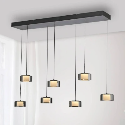 7-bulb LED pendant light Rika with height-adjustable pendants, dimmable via light switch The Rika LED pendant light in black impresses with its modern and minimalist design. With seven smoked glass panes and warm white LED bulbs, it provides a soft light and creates an inviting atmosphere above the dining table. Thanks to the Comfort Lift function, the height of the light can be adjusted effortlessly, with the mechanism in the canopy eliminating the need for disturbing counterweights. The height of each pendant can be individually adjusted to flexibly adapt to the room conditions. The pendant light is also equipped with SimplyDim technology, which allows the light intensity to be easily dimmed using the existing light switch. The brightness can be continuously reduced from 100 % to 10 % using the switching pulse. If the light is switched on again within 3 seconds of being switched off, the dimming process begins. When the maximum (100 %) or minimum brightness (10 %) is reached, the light remains at this setting for about 2 seconds before the process starts again. The desired brightness can be saved by switching off, so that the light shines at the saved brightness the next time it is switched on. This function makes it possible to adjust the light intensity to individual requirements and quickly recall it again. Place the pendant light above the dining table and create a cosy ambience.