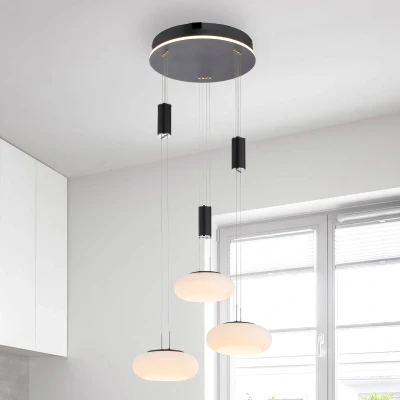 Height-adjustable LED pendant lamp Q-ETIENNE in the shape of a roundelThe three-light LED pendant lamp Q-ETIENNE can be ideally used to illuminate the dining or living room table. The three rounded light sources are made of glass, hang down at different heights and are height-adjustable by a pulley. With the included infrared remote control, it is possible to regulate the brightness as well as adjust the light color from warm to universal white. In addition, different light scenarios can be selected and the memory function can be used. Q-ETIENNE is ZigBee-capable and can be integrated into a correspondingly compatible smart home system. Subsequently, the light can also be controlled via app or voice command.Technical data/compatibility:- illuminated ceiling box- dimmable- height adjustable from 120 to 200 cm- light temperature adjustable from warm white to universal white- memory function- switching of up to 20 individual Q-lights or Q-lamps to max. 3 groups with only one Q-remote control- ZigBee-capable- controllable with the remote control- voice control by Echo (4th gen.), Echo Studio as well as Echo Show 10 (3rd gen.) directly possible- when integrated into a ZigBee-based smart home system also conveniently controllable via app or voice commandNote: For integration into a smart home system or app control, a bridge is required; this is not part of the scope of delivery