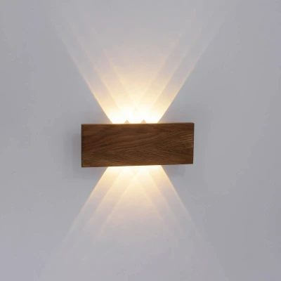 LED wall light Palma with wood decor, upward and downward light distribution The rectangular LED wall light Palma is equipped with warm white LEDs behind the cover made of an MDF panel with a beautiful wood decor, whose light radiates upwards and downwards, so that the wall light conjures up a decorative lighting effect with several small light beams upwards and downwards on the wall and indirectly illuminates the room.