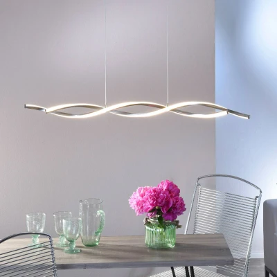 Polina LED pendant light with wave design and dimming function An LED board has been installed in each of the two curved light elements, which emits a warm white light colour. The twisted shape allows both direct and indirect light to be emitted, illuminating a dining room, for example. A special feature here is that the middle and upper light bars can be swivelled. The Polina light is continuously dimmable by operating the existing wall switch, allowing different lighting moods to be created. It also has a memory function, so that when it is switched on again, it automatically reproduces the last selected brightness mode.