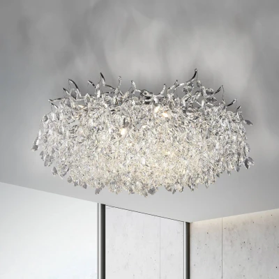 Ricicle ceiling light made of chrome-plated metal with crystal pendants The Ricicle ceiling light looks luxurious and elegant in any room, whether living room, entrance hall, hotel lobby, restaurant or hall. The elegant, sweeping light made of shiny chrome-plated metal is fitted with countless strands of sparkling crystal pendants and presents a breathtaking play of light that will enchant any room. Its pompous presence and exclusive radiance make the light an elegant eye-catcher in any room. The ceiling light is fitted with G9 sockets, which can be used with LED bulbs as well as halogen bulbs to keep up with the latest energy efficiency standards. The glass crystal pendants reflect the light in a fascinating way and create an inviting and dazzling atmosphere.
