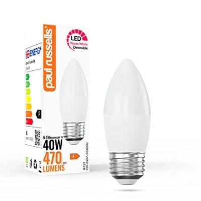 paul russells LED Candle Dimmable Edison Screw Light Bulbs, 5.5W 470LM E27 C37 40w Equivalent, 2700K Warm White, Dimmer ES Energy Saving Ceiling Lights, Pack of 1