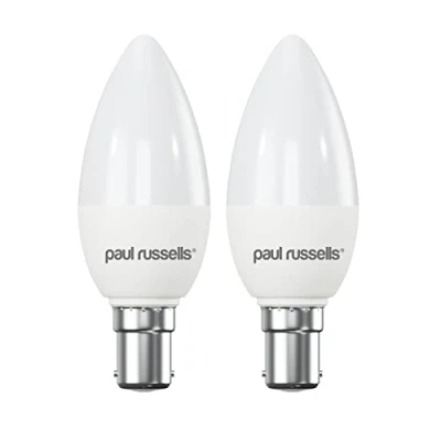 paul russells LED Candle Small Bayonet Fitting Dimmable Light, 5.5W B15 C37 Bulbs, 40w Equivalent, 6500K Daylight, Dimmer SBC Energy Saving Ceiling Lightsbulbs, Pack of 2