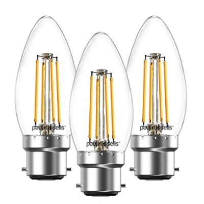 paul russells LED Filament Candle Dimmable Bayonet Cap B22 Light Bulbs, 4.5Watt 470Lumens C35 40w Equivalent, 2700K Warm White Dimmer BC Energy Saving Chandelier Lamps, Pack of 3