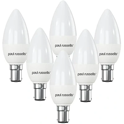paul russells LED Light Small Bayonet Cap B15, 40w Equivalent Bulb, 4.9W 470LM Bulbs, 6500K Daylight Lamps, Frosted C35 SBC Candle Energy Saving Lightbulbs, Pack of 6