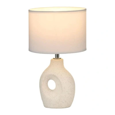 Lights.coPure Crush table lamp made of white fabric and beige ceramic The Pure Crush table lamp is a cosy additional light source in the living room and bedroom. Its white, cylindrical shade is made of textile. The base, which stands out with its asymmetrical design including a hole, is handmade from beige ceramic. Including plug cable with switch.
