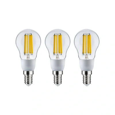 In a pack of 3 - the LED drop lamp with E14 base, warm white, filament, 2.5 watt The ultra-efficient light sources of the Eco-Line by Paulmann combine innovation with sustainability. Thanks to the 60% lower energy consumption and the significantly longer service life compared to standard LED lamps, energy costs can be significantly reduced and, by the way, the environment can be protected. The E14 LED drop lamp with filament optics produces a high lumen value of 525 lumens with only 2.5 watts and replaces conventional incandescent lamps in the 43 watt range. Their warm white light in combination with the optics make them an ideal option for openly designed luminaires. - Practical set of 3