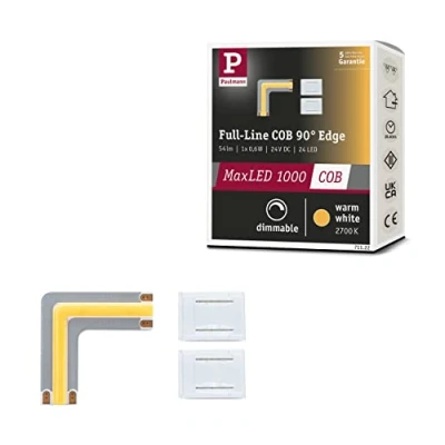 APPLICATION – The perfect complement for a MaxLED 500 Full Line COB lighting concept installed across a corner. FULL-LINE COB STRIPS – The MaxLED 500 Full-Line COB Strips are so powerful that they can also be used as room illumination. INCLUDED IN DELIVERY – Each corner comes with two light connectors. COLOUR TEMPERATURE – The colour temperature is 2700 Kelvin, which corresponds to a warm white light. EXCHANGEABILITY - Light source is non-exchangeable, the luminaire must be replaced. This product is a containing product. Containing products are luminaires that can be disassembled for a separate check of the light source(s) they contain. This product contains a light source of energy efficiency class G.