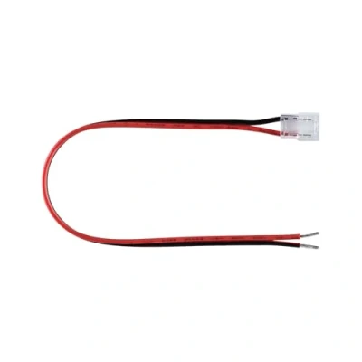 AREA OF APPLICATION – Power supply for single-colour strips (2-pole), 10mm wide LENGTH – The cable is 20cm long. LIGHTING EFFECT – Transparent housing to prevent disruption of the lighting effect SLIMLINE DESIGN – The slimline design is particularly well-suited for use in tight installation spaces, e.g. inside a profile APPLICATION – Designed specifically for professional 24V Pro Strip Silver and Gold